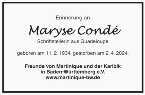 Der nächste Termin der Freunde von Martinique ist am 14. Juli, dem französischen Nationalfeiertag, an dem sich die Mitglieder traditionell im Zeichen von Freiheit, Gleichheit und Brüderlichkeit treffen. "Die musikalische und literarische Veranstaltung wird in diesem Jahr der Schriftstellerin und Trägerin des alternativen Nobelpreis für Literatur aus Guadeloupe Maryse Condé gewidmet sein, die am 2. April 2024 verstorben ist und zu deren Ehren der Verein bereits 2022 einen Baum an der Lichtentaler Allee pflanzen lies", kündigt der Verein an.